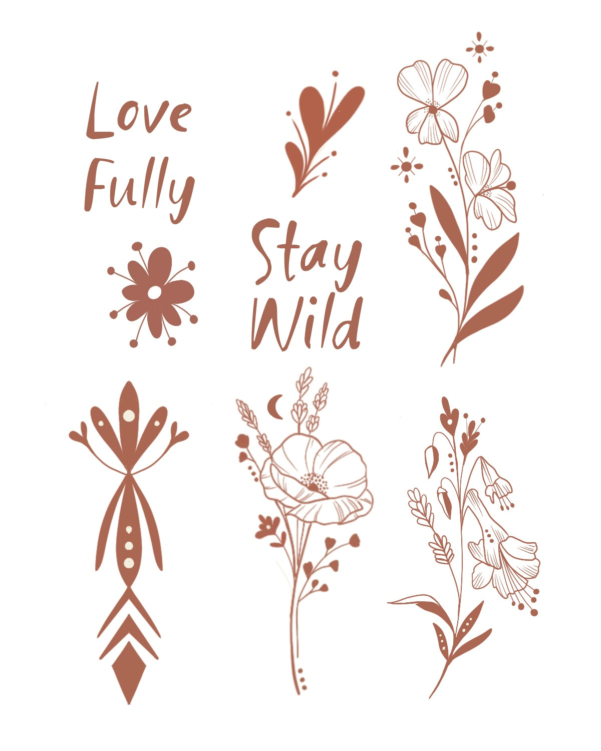 Wear a little reminder to love yourself and others fully, through all the seasons, with Orchid & Pine's Love Fully luxe henna temporary tattoo. Each 4" x 5" sheet includes two messages, "Love Fully" and "Stay Wild," along with hand-drawn florals, illustrated by Orchid & Pine's founder, Charina. Enjoy these chic, understated henna tattoos with your favorite neutral-toned dresses, creamy flutter tops, or boho dresses for a barely there hint of florals to elevate your love vibe.