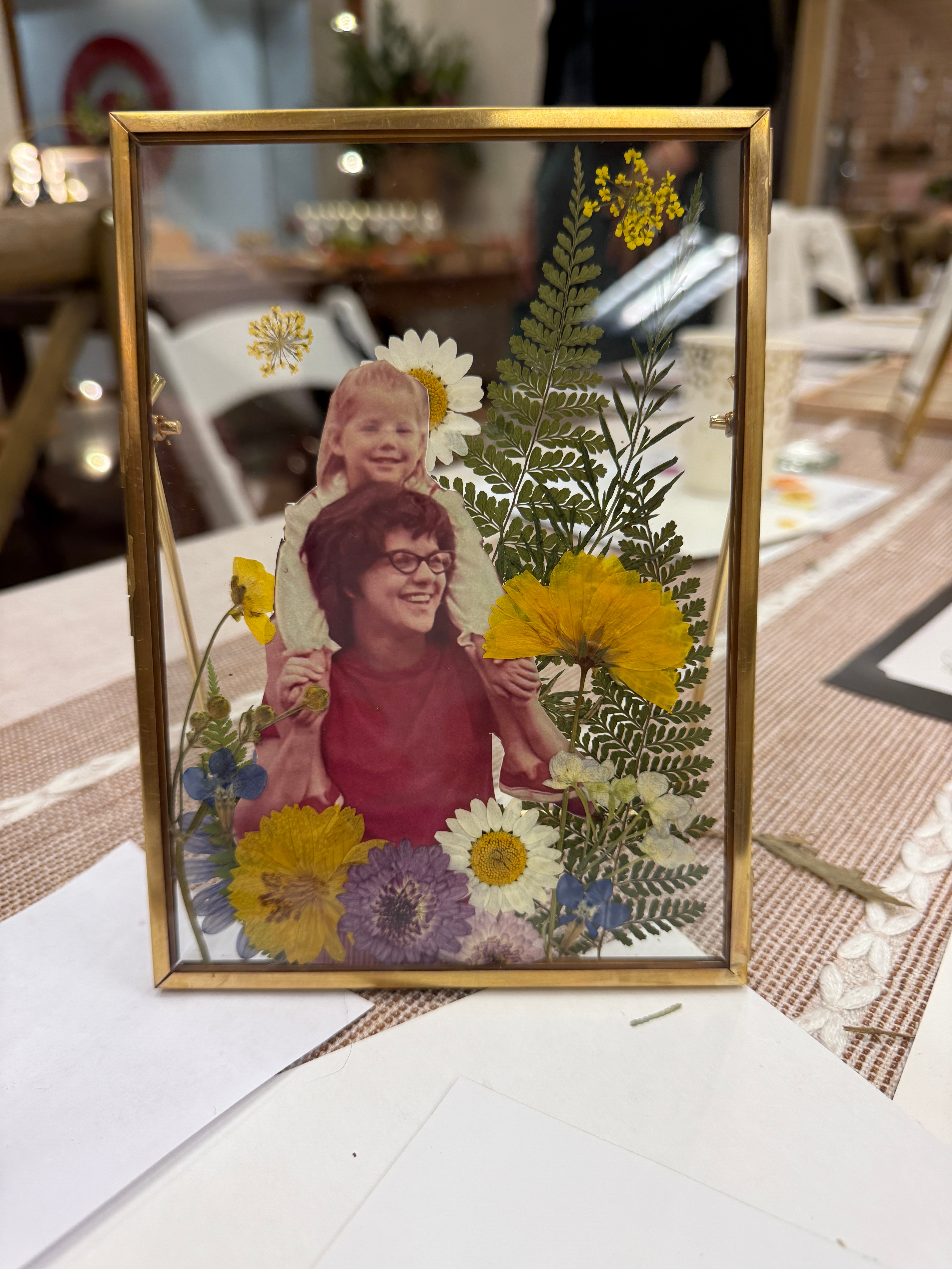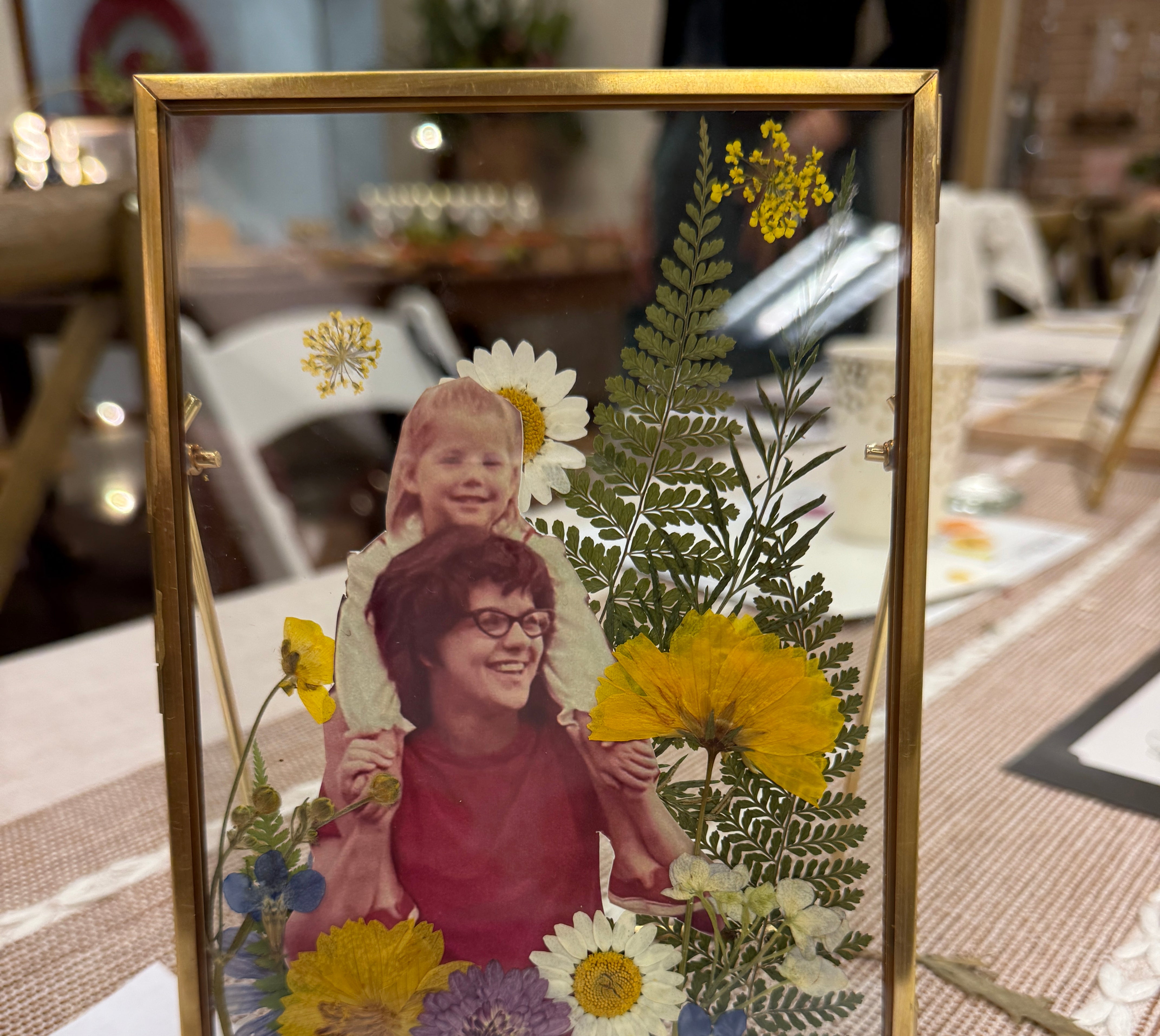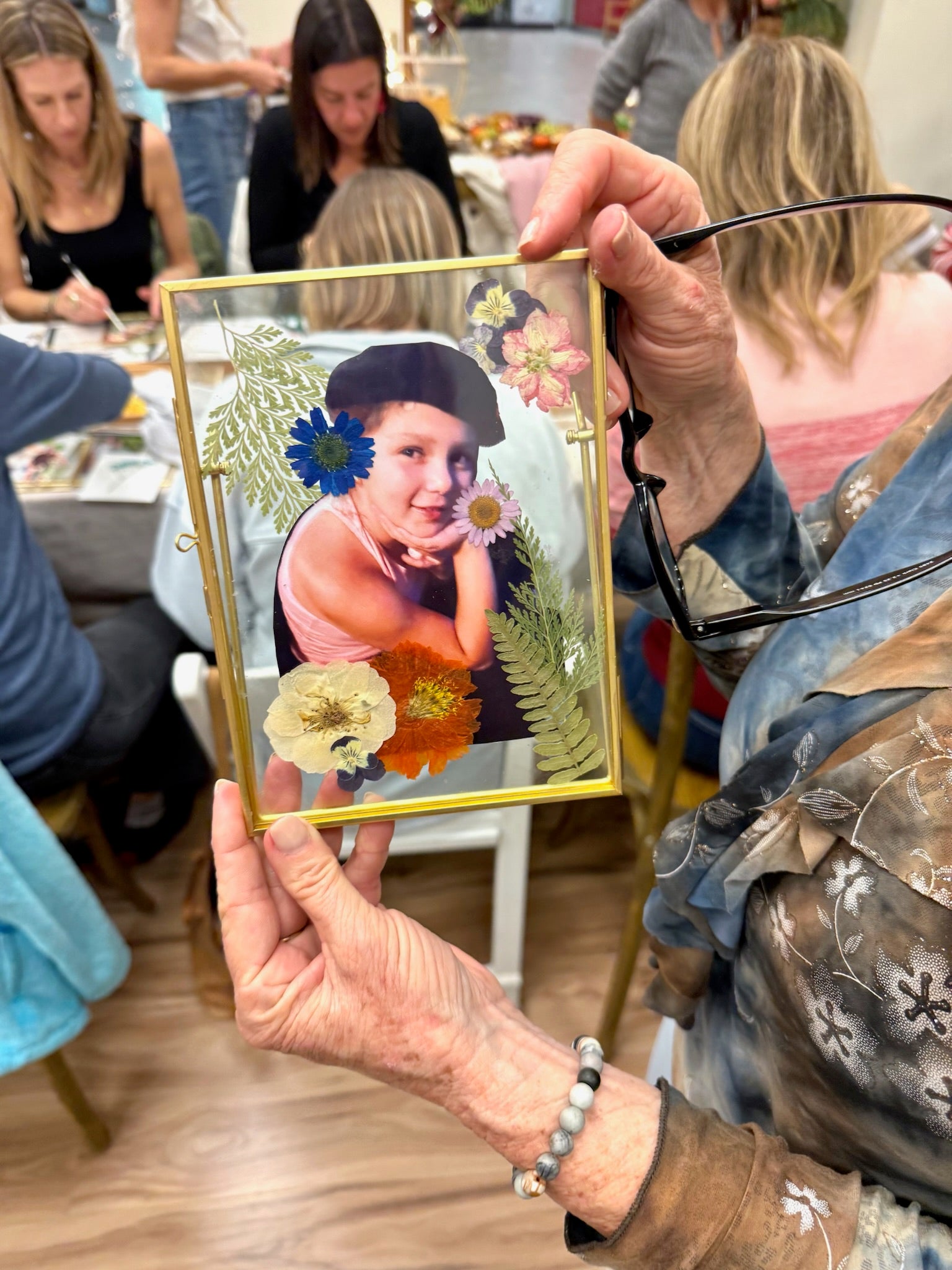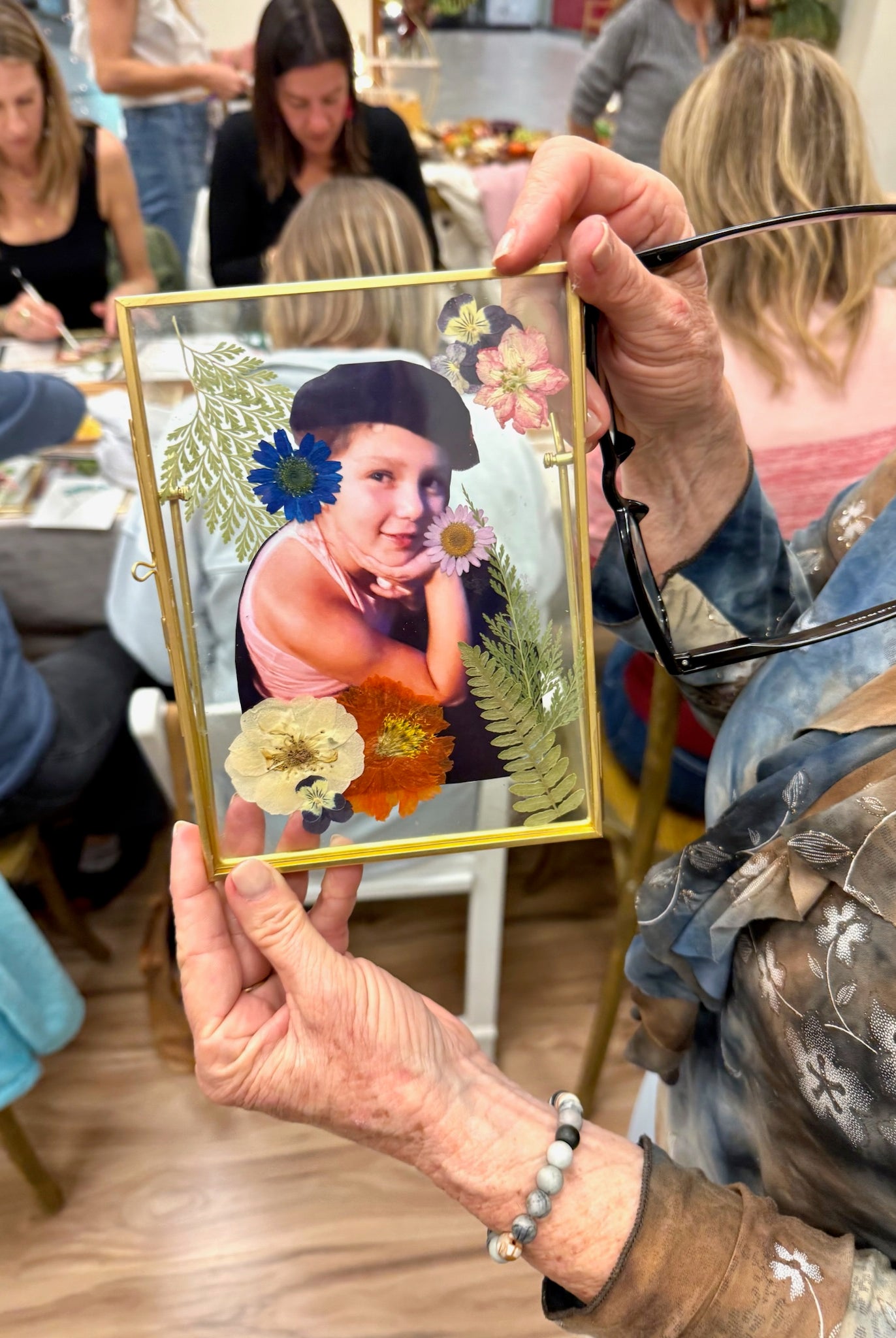 It’s been a while since I’ve taken an art class of any type. Time and money were factors, but mostly I missed something that spoke to my heart. My first interaction with Charina of Orchid and Pine was so welcoming that I knew I’d found just what I needed: flowers, learning new skills, incorporating parts of my life, and a beautiful environment. The pressed flower frame class, hosted at Home by Zinnia’s in Scotts Valley, featured a beautiful layout of needed supplies and clear, well-thought-out instructions that allowed participants to explore the process while making connections to the people involved and the images we were working with. The food, libations, and décor of Home by Zinnia’s made it a perfect Sunday evening treat. Being able to return home with a beautiful frame filled with flowers and a precious picture was exactly what my heart needed!