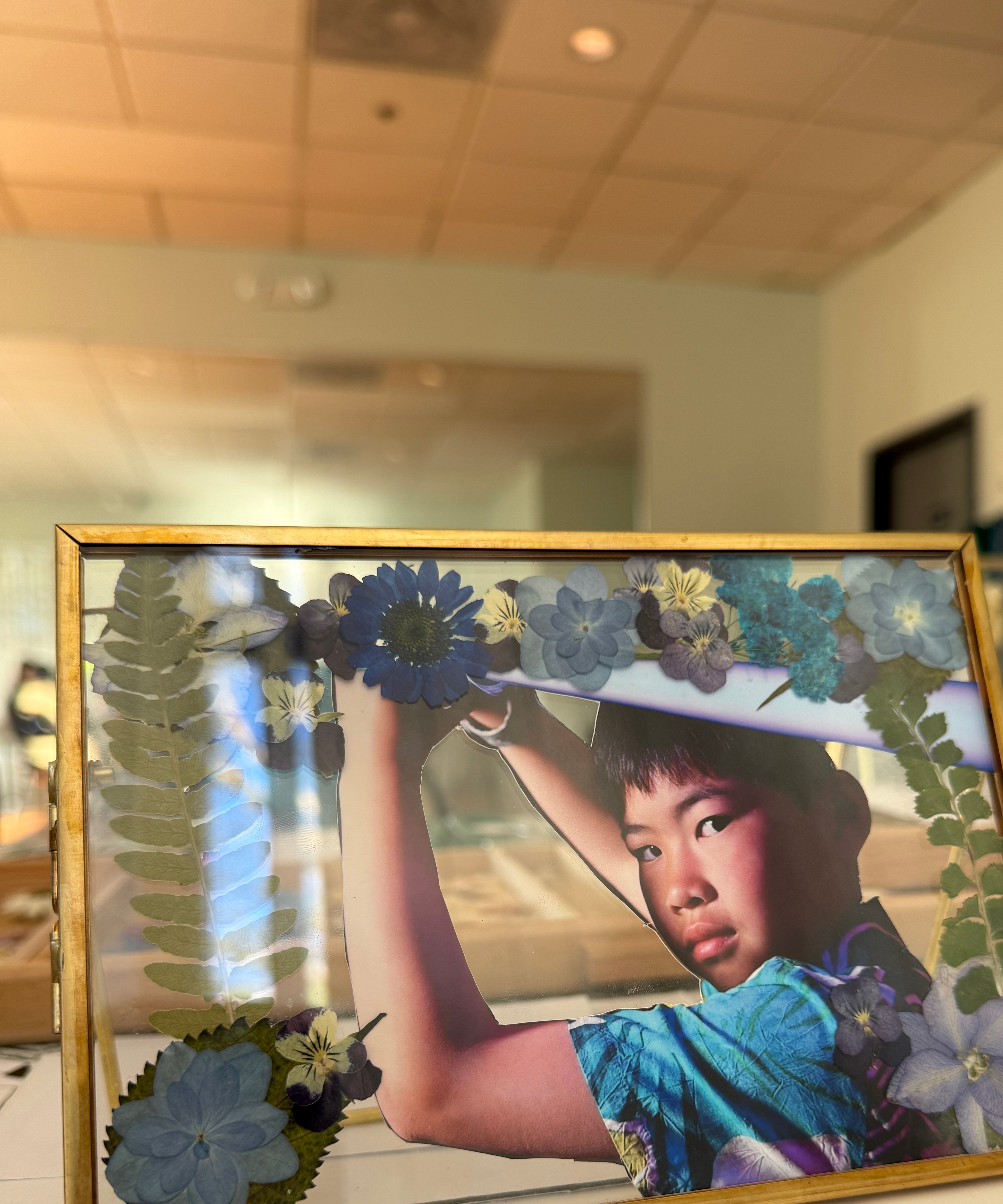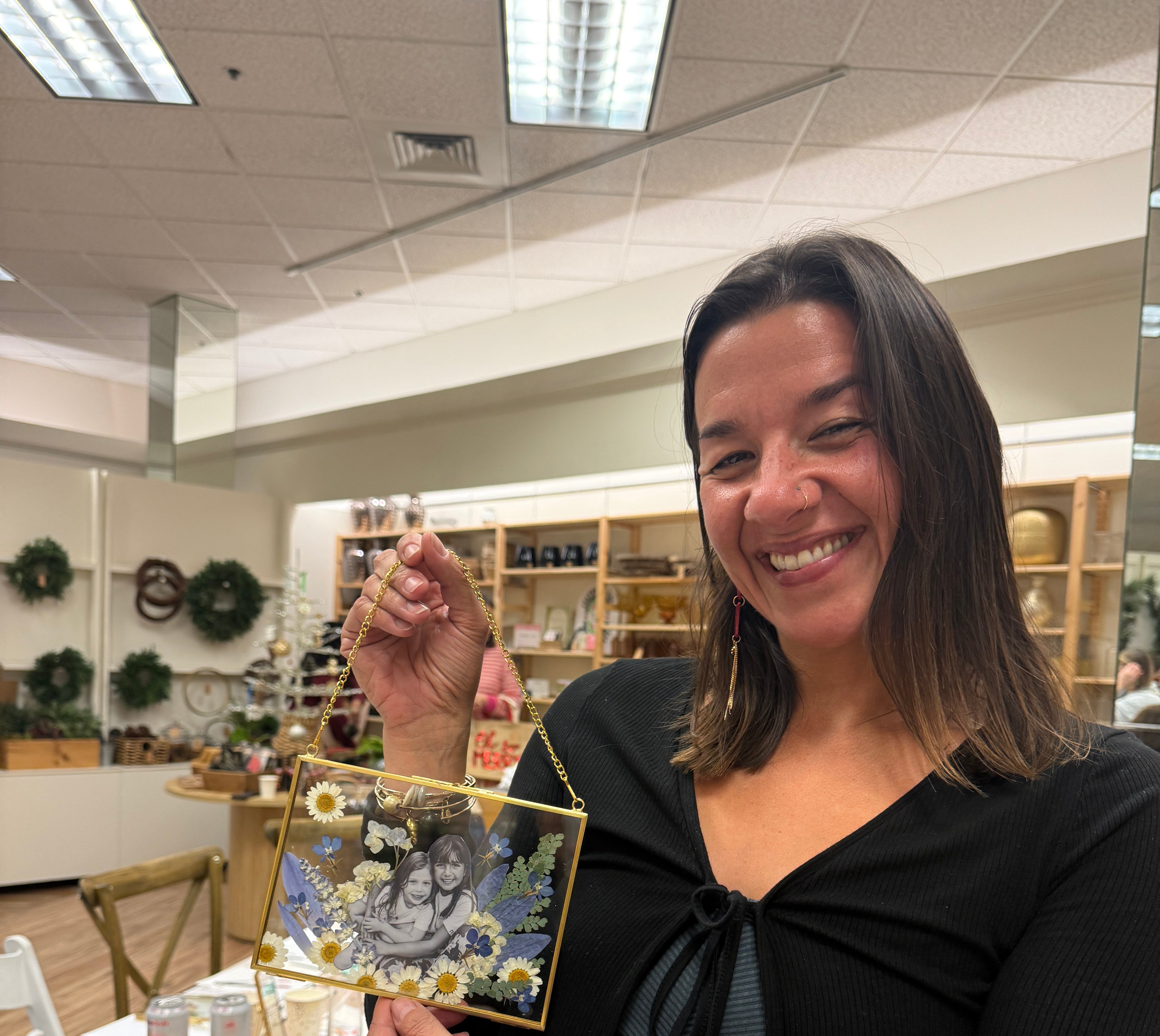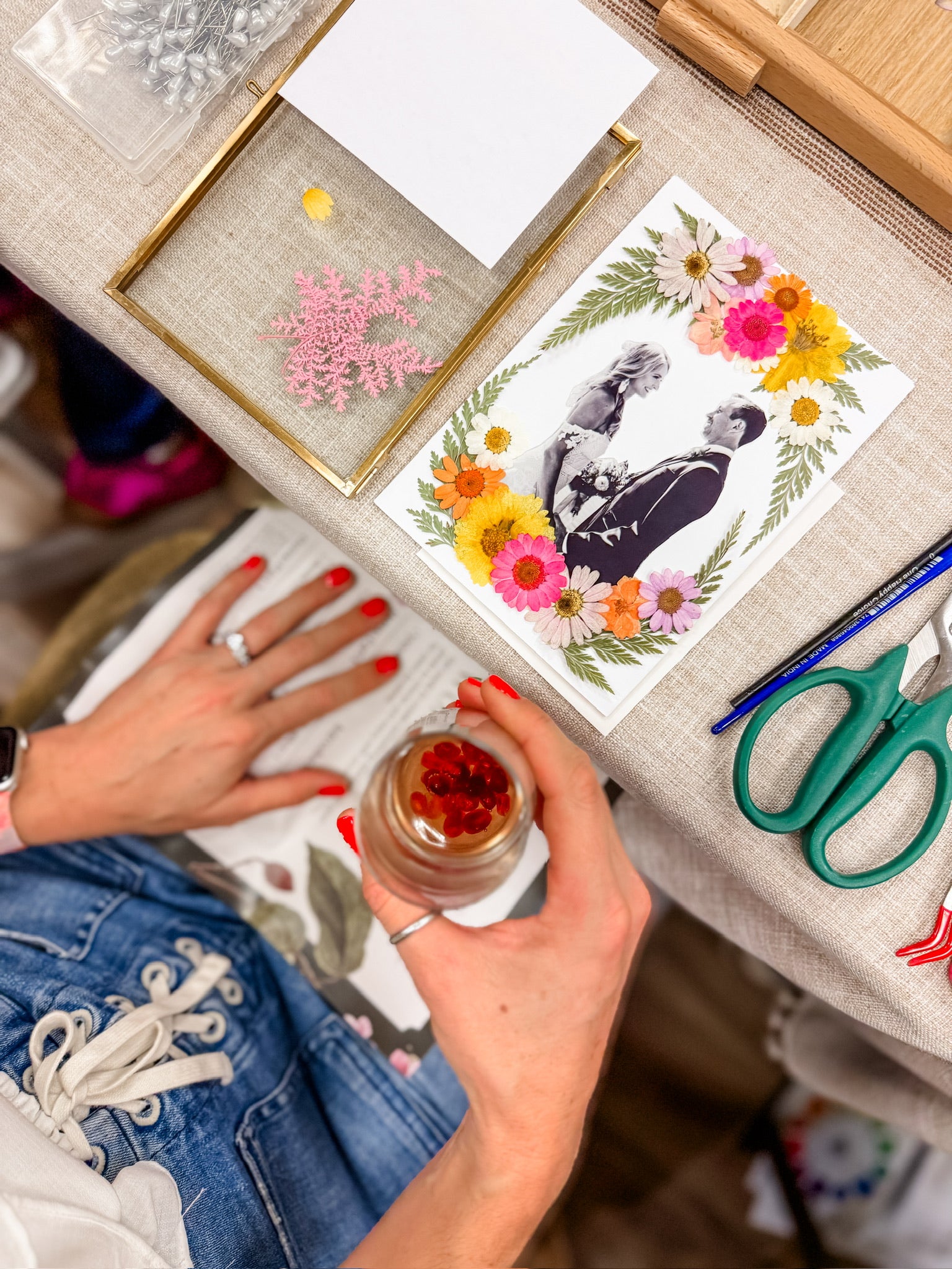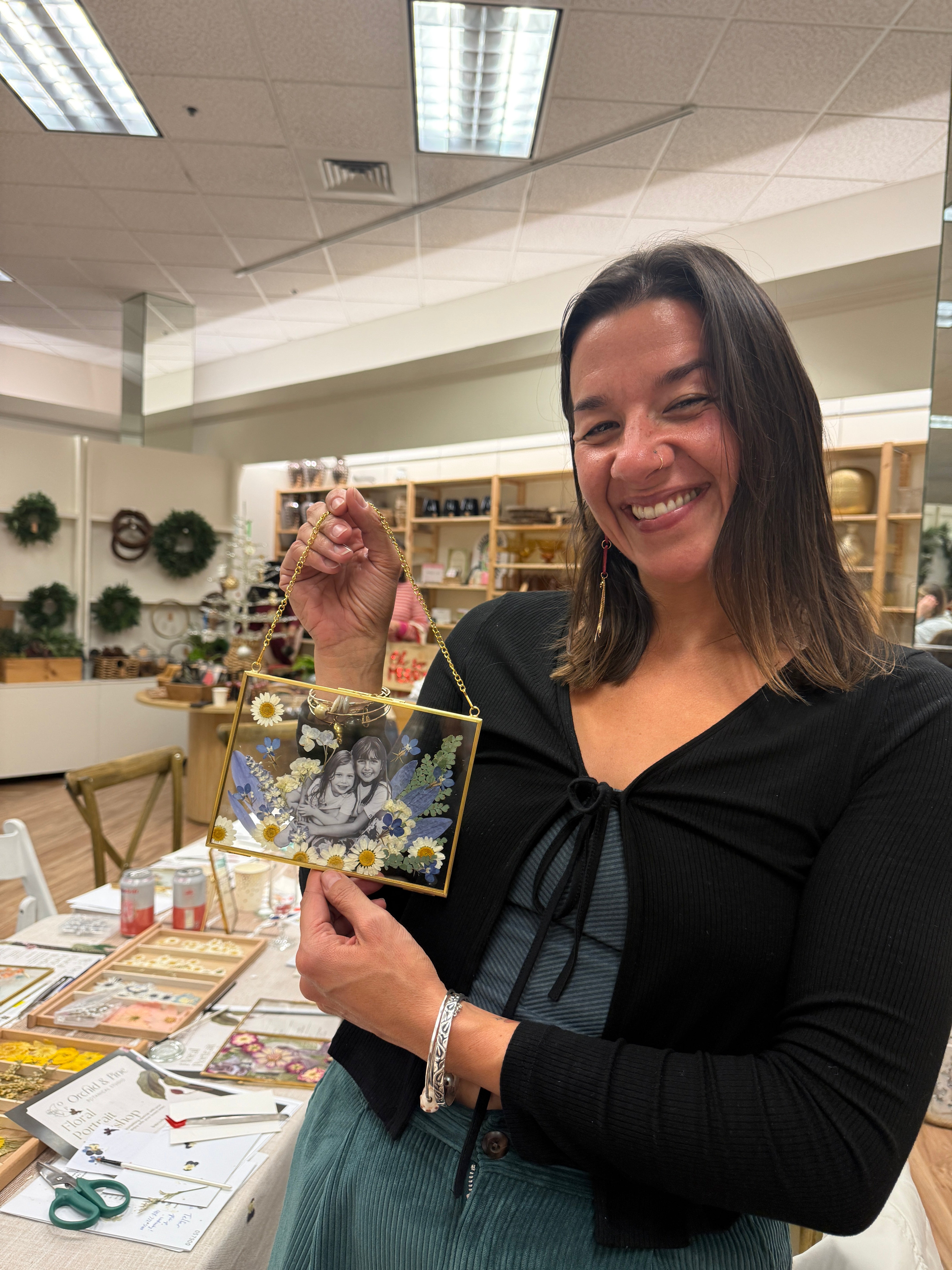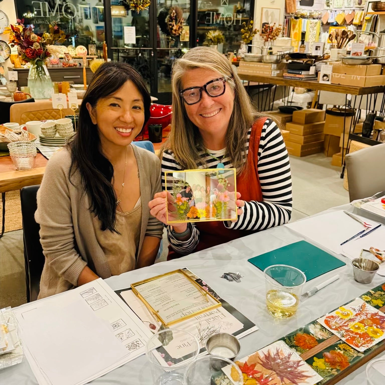It’s been a while since I’ve taken an art class of any type. Time and money were factors, but mostly I missed something that spoke to my heart. My first interaction with Charina of Orchid and Pine was so welcoming that I knew I’d found just what I needed: flowers, learning new skills, incorporating parts of my life, and a beautiful environment. The pressed flower frame class, hosted at Home by Zinnia’s in Scotts Valley, featured a beautiful layout of needed supplies and clear, well-thought-out instructions that allowed participants to explore the process while making connections to the people involved and the images we were working with. The food, libations, and décor of Home by Zinnia’s made it a perfect Sunday evening treat. Being able to return home with a beautiful frame filled with flowers and a precious picture was exactly what my heart needed!